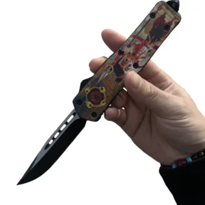 The 5.5″ UTX70 Yellow Series Dessert Warrior OTF Knife brings together playful design and high performance. Featuring a striking yellow anodized handle and a “dessert warrior” motif, this knife combines fun, function, and precision in one compact package. The double-action OTF mechanism provides quick blade deployment with ease, while the ergonomic grip ensures comfort for everyday carry. Whether you’re a collector or someone who enjoys having a unique and reliable tool, this knife is the perfect addition to any EDC setup or display.