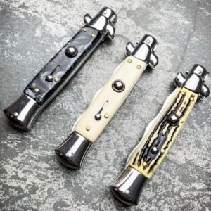 Das Godfather Stilettomesser im klassischen italienischen Stil – Springmesser mit automatischem Klingendesign – KRIS – 9 Zoll. Der Griff hat obere und untere Griffschalen aus Acryl oder Holz. Der Druckknopf gibt die gewellte Klinge mit silberfarbener Hochglanzoberfläche schnell frei. Anschließend lässt sich die Klinge mithilfe der Drehstütze schließen und mit der frontseitigen Sicherung sichern. Erhältlich in mehreren Farben.