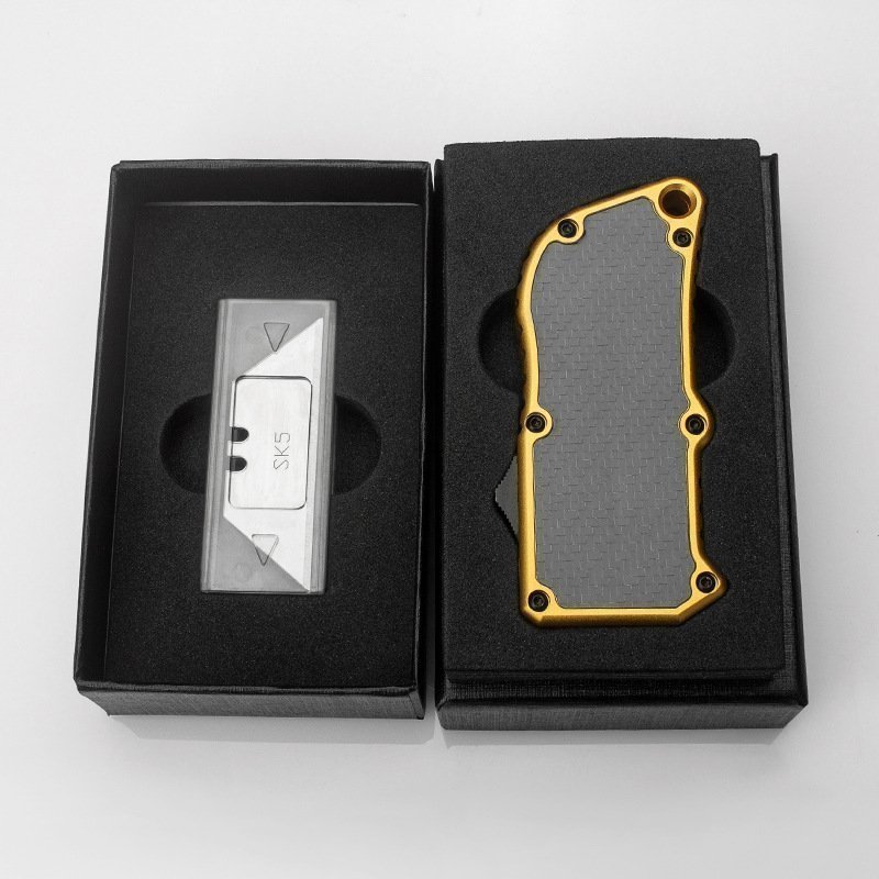 Description: This small Out The Front utility knife fits in a pocket, removes the replacement blade, and comes in a beautiful gift box. It has an excellent safety device to keep the blade from dropping in any situation, and the handle is made of carbon fiber material, making it smoother in the hand.